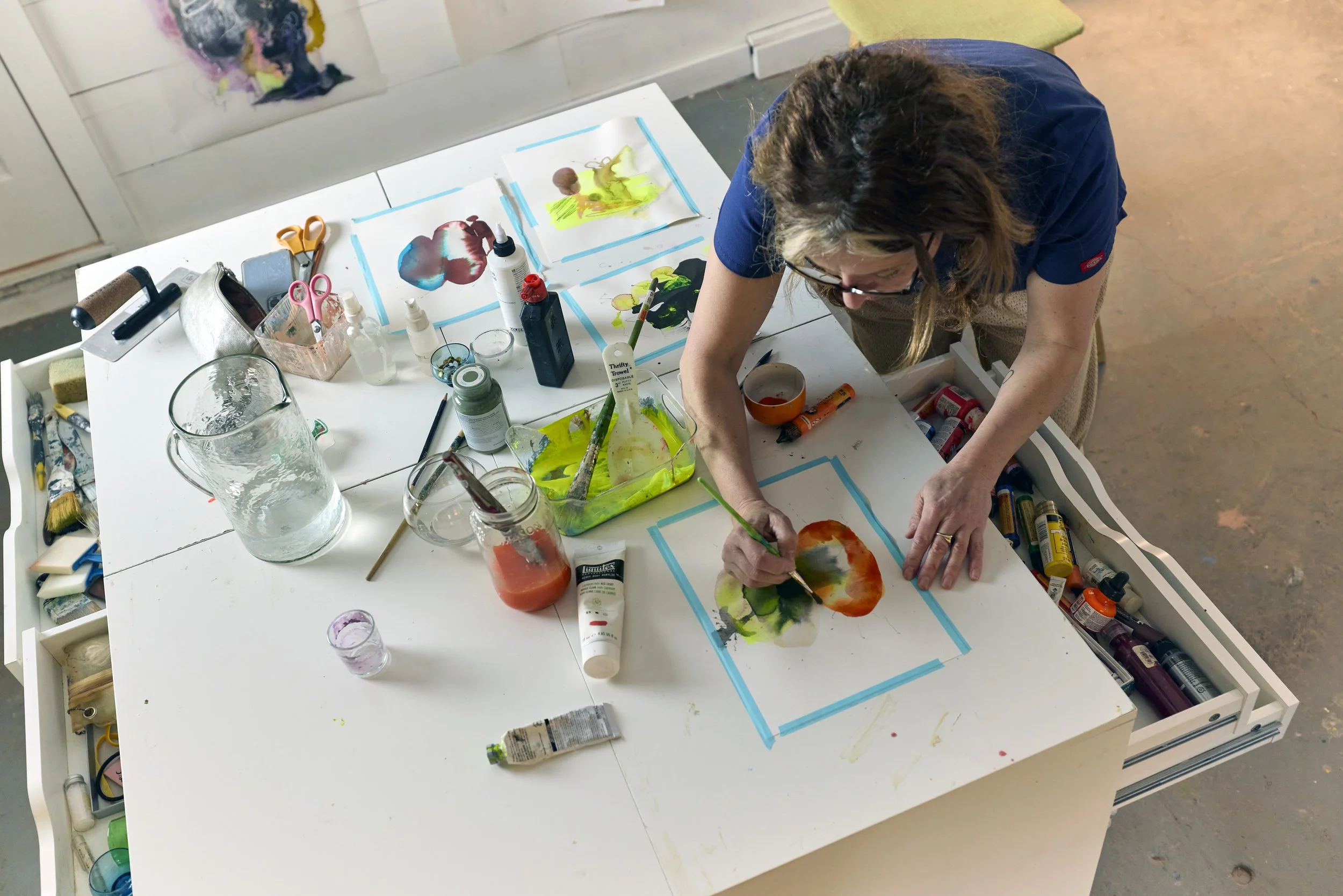 Her work explores the intersection of nature, memory, and the human psyche through layered processes that combine painting, photography, digital manipulation, collage, and hand-drawn mark-making. Working across watercolor, Duralar, canvas, and print-based surfaces, she builds compositions that balance structure with intuition.